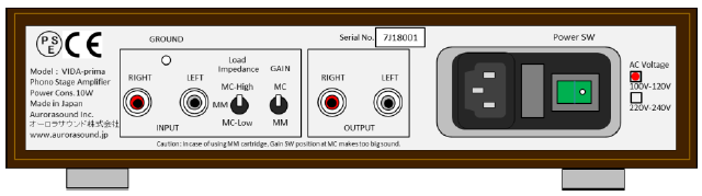 Si la façade se veut sobre et dépouillée – elle ne contient que le contacteur orange de mise en veille – la face arrière intègre les fiches d’entrée et de sortie au seul standard RCA, la fiche secteur IEC, l’interrupteur de mise sous tension ainsi que les réglages de gain et d’impédance. Le premier, à 2 positions, permet de sélectionner le gain MM ou MC, soit 40 ou 64 dB. Le second, à 3 positions, permet de sélectionner la charge: MM, MC haut niveau et MC bas niveau.